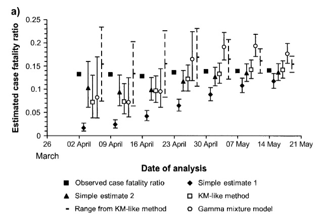 A statistic of great importance during an epidemic is the case fatality ratio (CFR). This is the number of cases that are detected that result in fatalities. Were one to try and estimate this using the naïve estimator of simply taking the number of cumulative deaths attributed to the disease in question D(t), and divide this by the cumulative number of cases C(t), so that