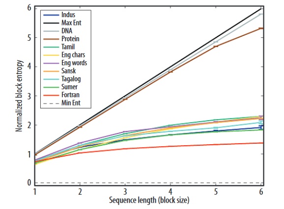 However, just because traditional methods of deciphering ancient languages can’t be applied here, doesn’t mean that we should give up. In fact, statistical sampling of example inscriptions can be done, from which conditional probabilities for particular sequences of symbols can be constructed, and the conditional entropy can be inferred from inscriptions of varying lengths, and compared to the expected result for known linguistic writing systems: